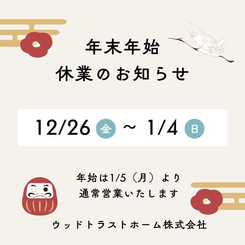 当社の年末年始休暇は 12月26日~1月4日までとなっております。 1月5日から通常営業致します。 メール等のご返信も1月5日になります。 ご了承ください。 本年度も皆様には大変お世話になりました。 来年も感謝の気持ちを忘れず、より一層精進してまいりたいと 思っておりますので、何卒よろしくお願い致します。 どうぞ良いお年をお迎えください |